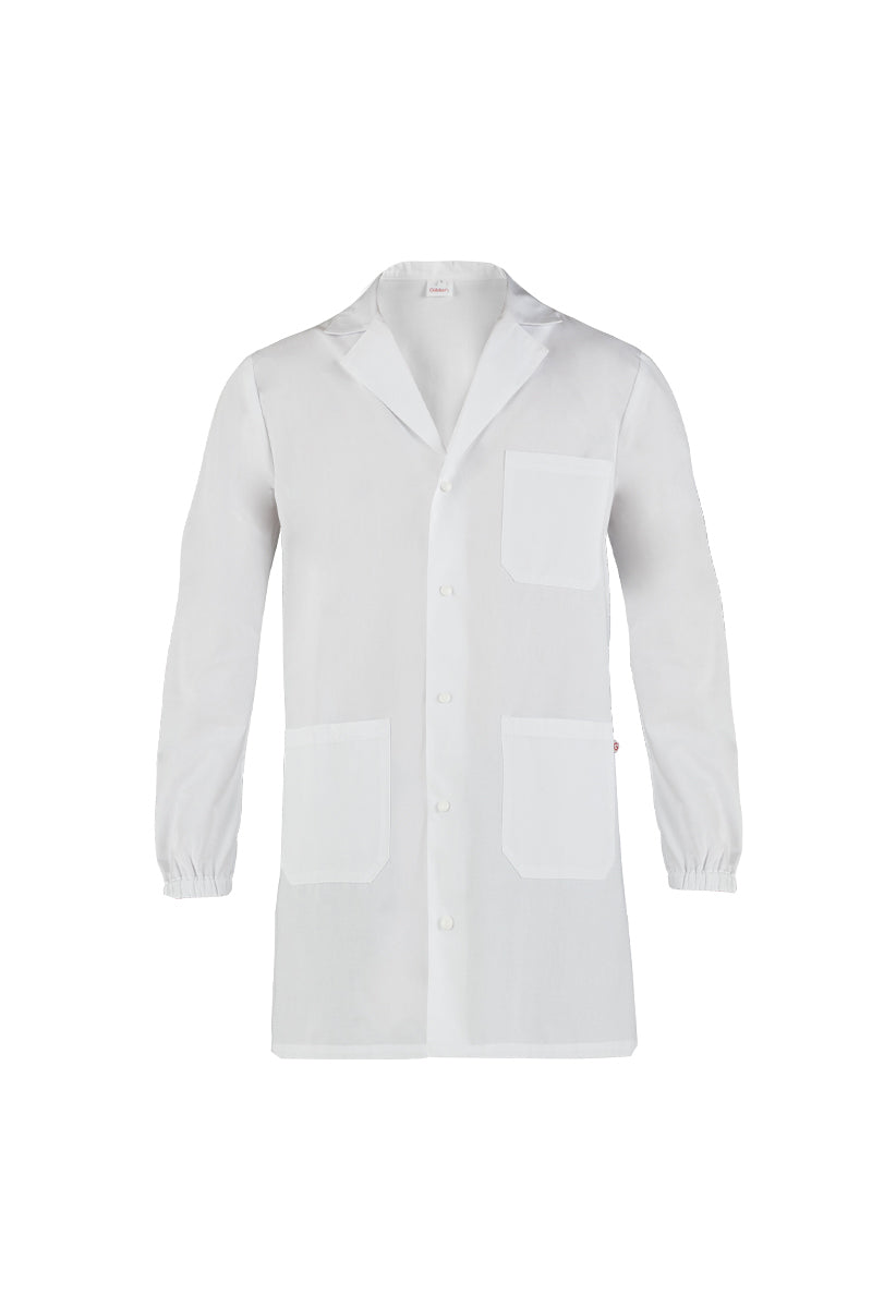 Presenta un collo tipo giacca con revers ribattuto da un’impuntura a riva, chiusura centrale con cinque automatici in pasta bianca estremamente resistenti, due tasche di media grandezza ed un taschino portapenne.