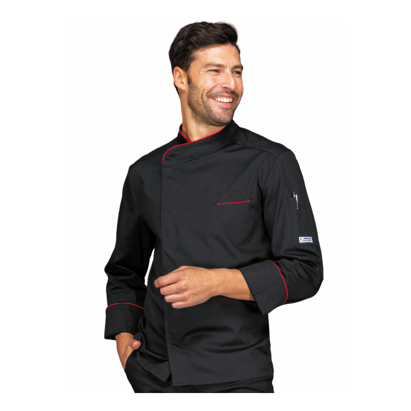 Giacca da New Zac Unisex a manica lunga, colore nero e rosso, ideale come divisa professionale per uomo e donna. Perfetta per chef, aiuto cuoco, pizzaiolo, catering e per tutti gli ambienti di ristorazione grazie al suo design moderno e funzionale.