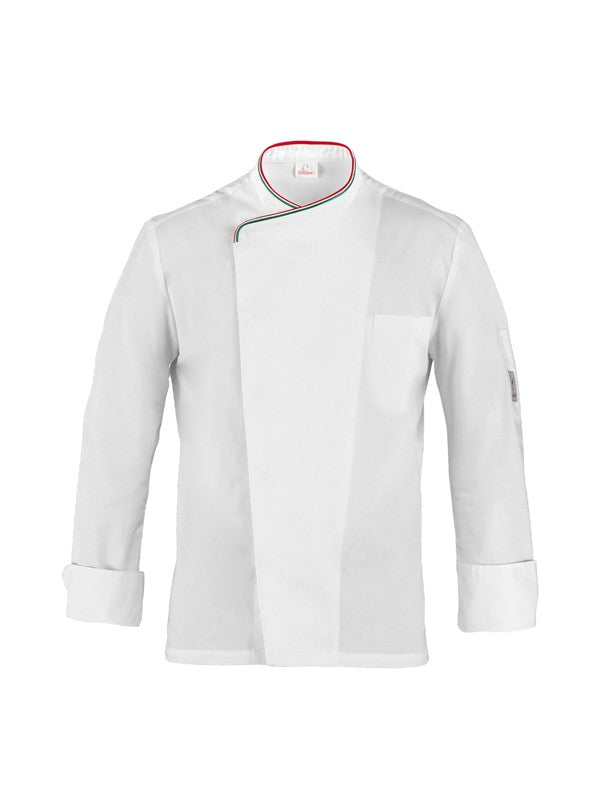 Composizione: bottoni a pressione, taschino sul petto, taschino portapenne sulla manica, inserti in rete, profilo tricolore italiano.