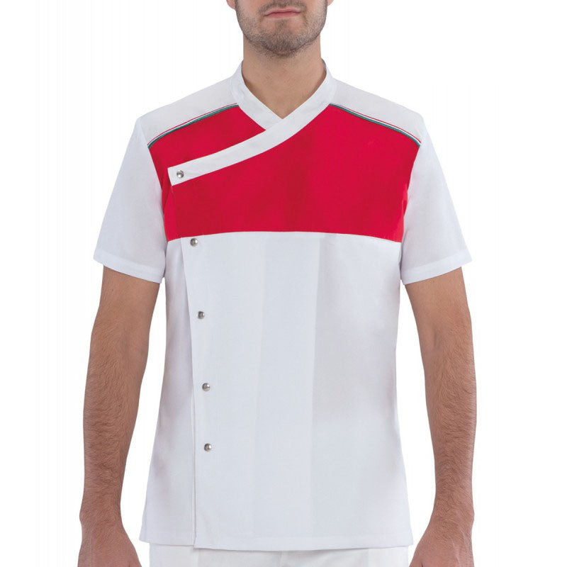Giacca pizzaiolo in 100% cotone, con bottoni a pressione, taschino sul petto e inserti in rete.